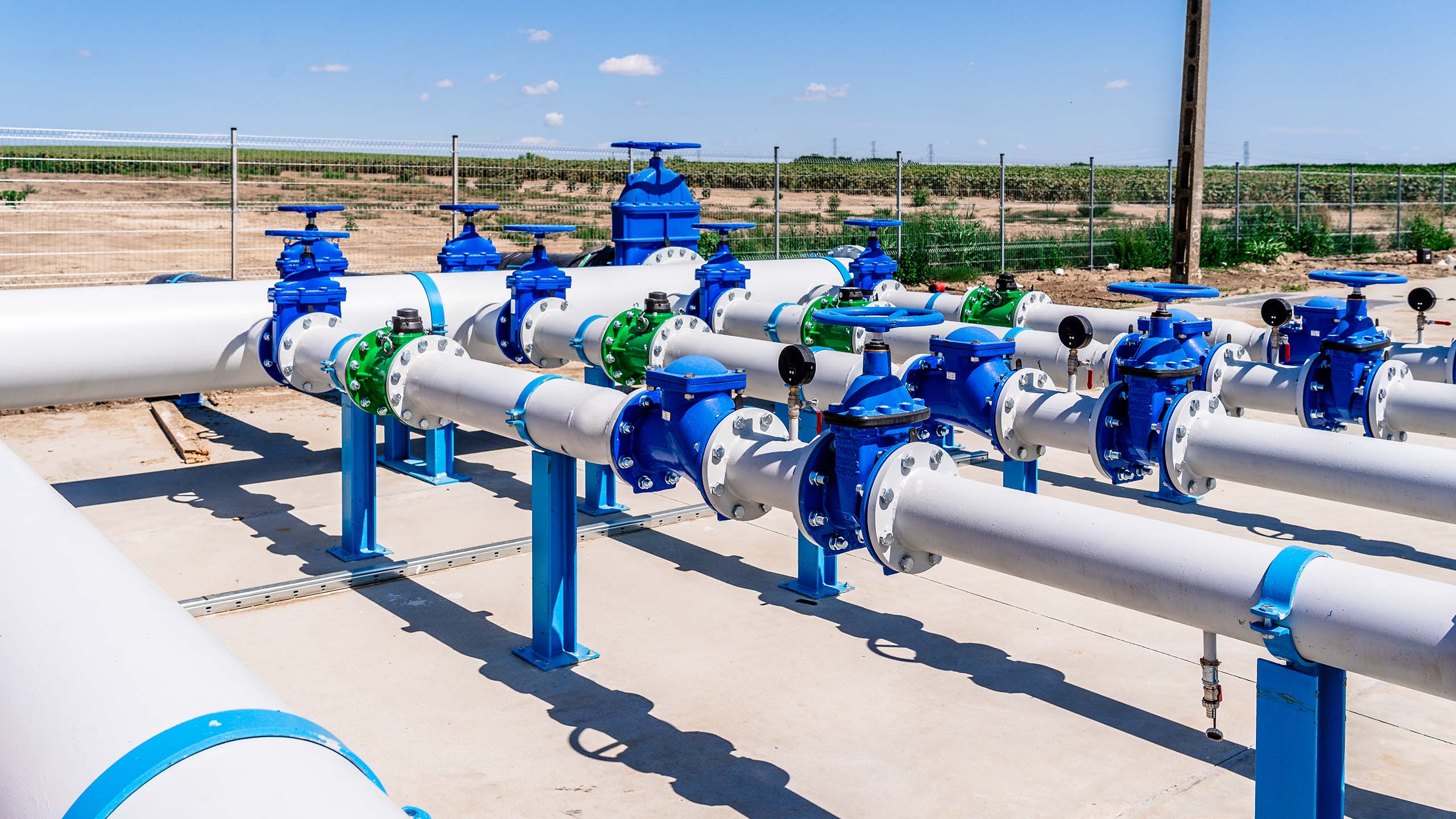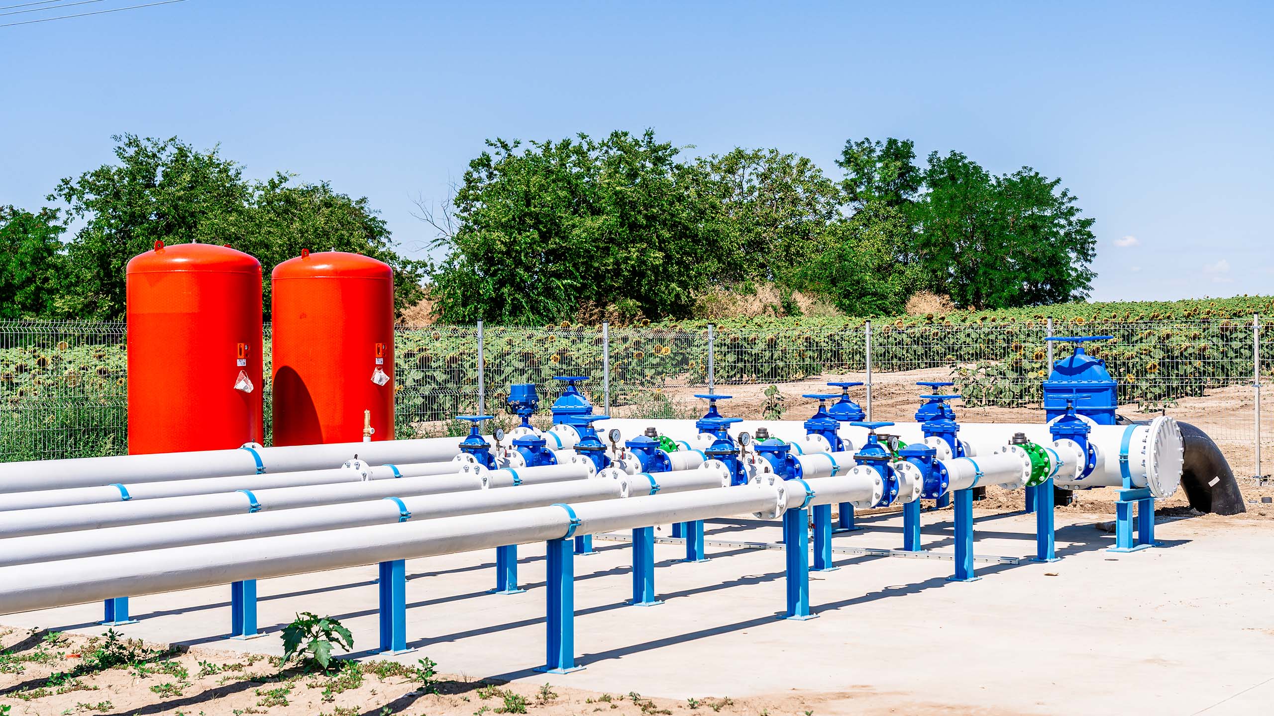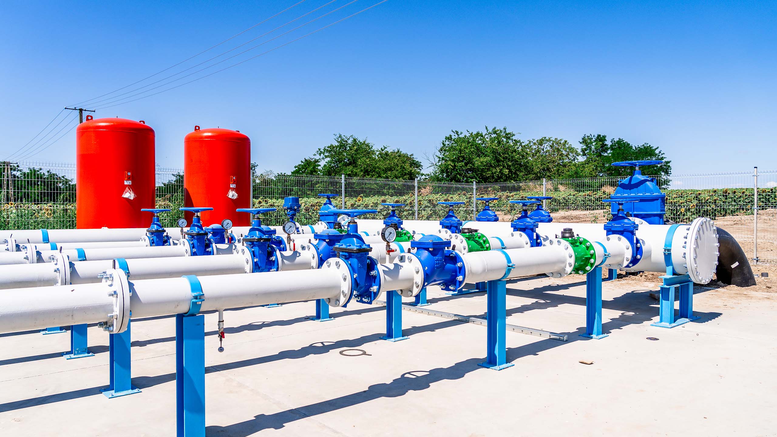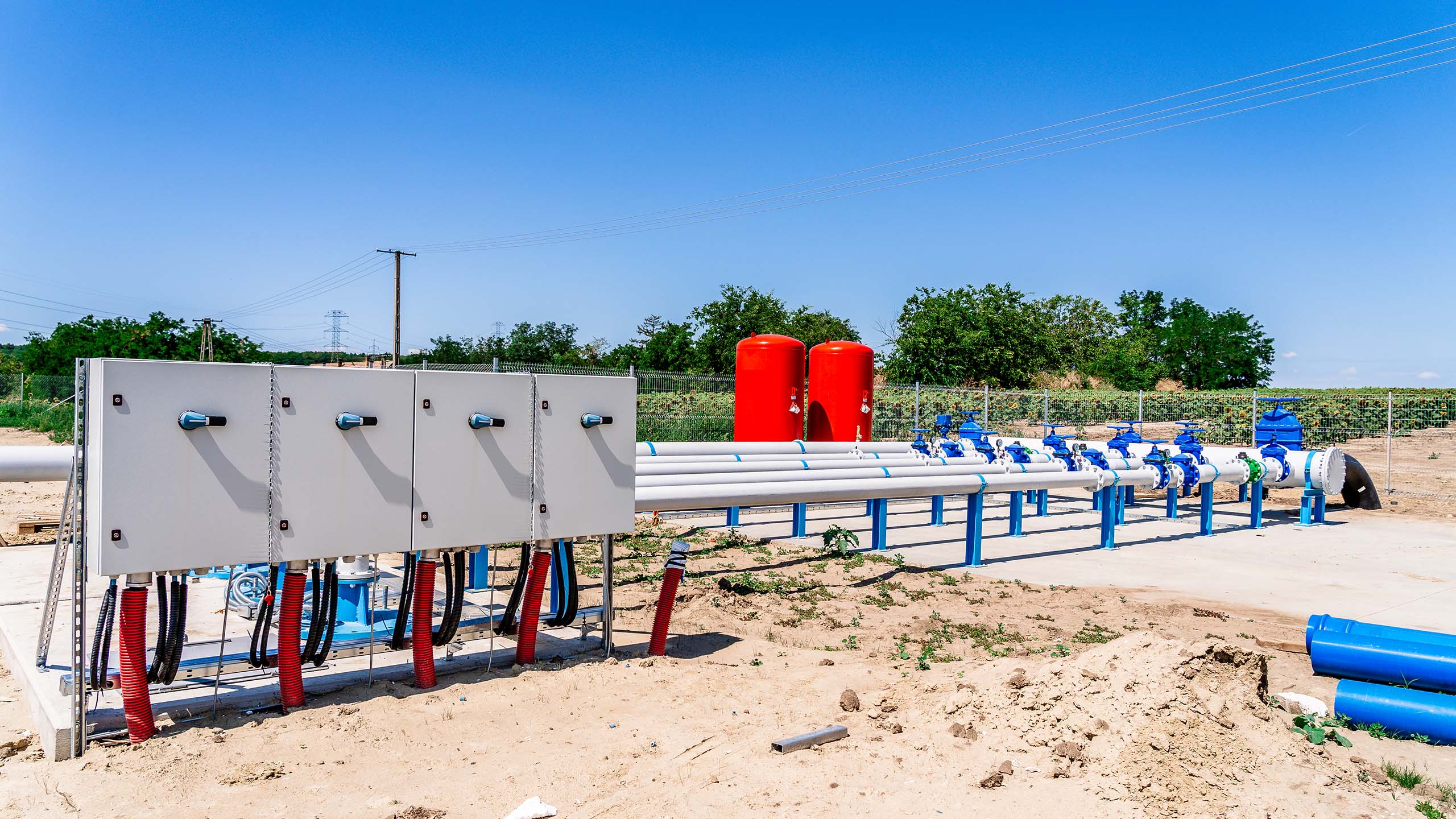 Komplex öntözési vízhálózat megvalósítása kúthálózattal, főnyomóvezetékekkel és nyomásfokozó állomásokkal, mezőgazdasági területek megbízható vízellátásához.